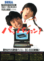SEGAのパソコンです。当時ほとんど無名ではないかと思うとんねるずの起用です。現在の彼らの活躍を予想して起用しているなら非常に先見性があったことになります。でも、このSC3000は全然話題にもならなかったような気がします。ハードのスペックはMSXと非常に似ていました。また、この機種からパソコンの機能を除き純粋にゲーム機にしたSG1000というゲーム機もありました。これは斉藤ゆうこさんだったかが宣伝していました。